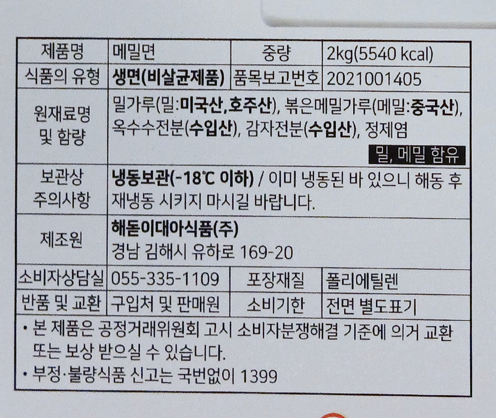 | 원재료명 및 함량(농수산물의 원산지 표시에 관한 법률에 따른 원산지 표시 포함) | -.소맥분(호주,미국산),메밀가루(중국산),수분,식염,옥수수전분 |
