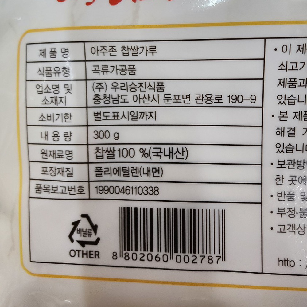 | 제품명 | 아주존 찹쌀가루 300g(국내산)/우리승진식품 |
