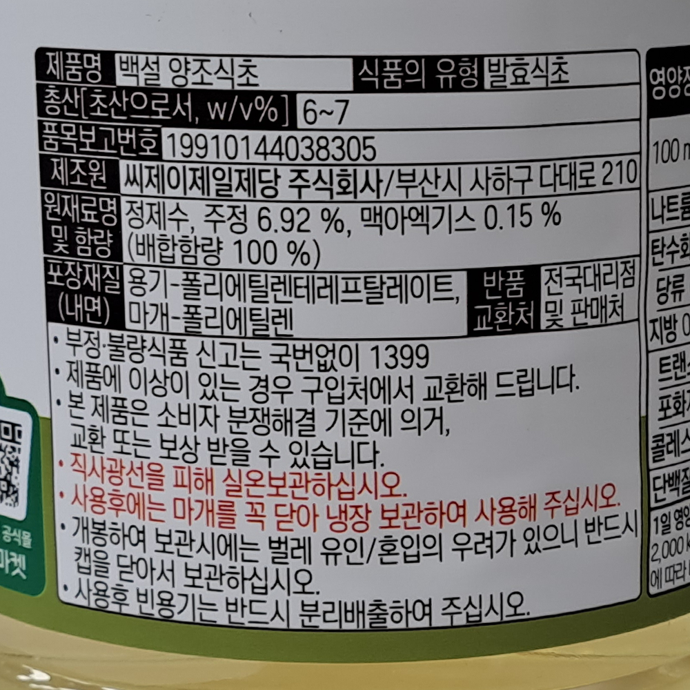 | 제품명 | 백설 양조식초 1.8L/CJ |