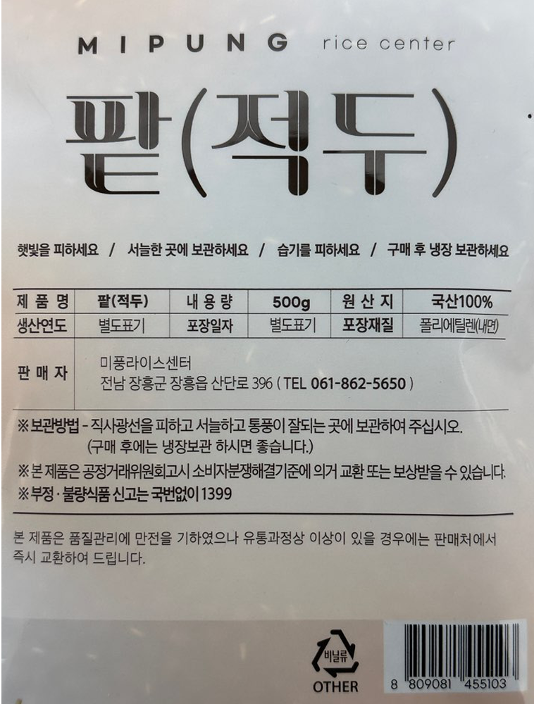 | 품목 또는 명칭 | 팥(적두)·500g/미풍라이스 |
