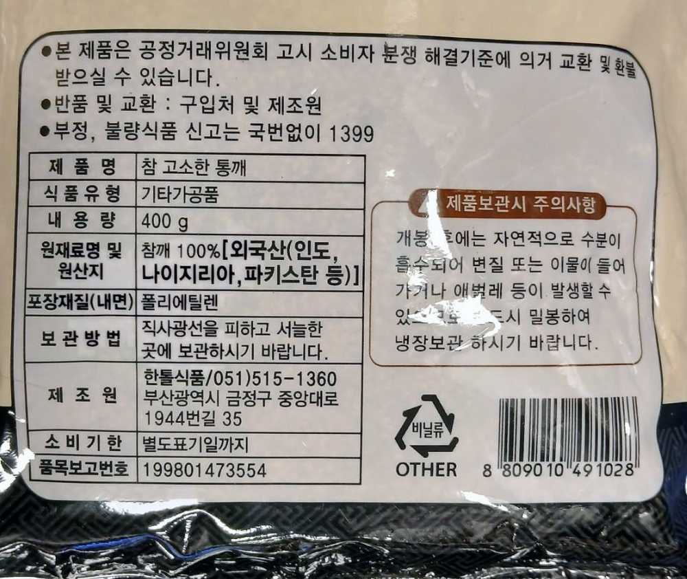 제품명 참고소한 볶은통깨 400g(외국산)/한톨식품