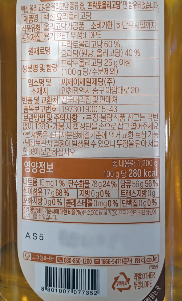 | 제품명 | 백설 요리올리고당 1.2kg/CJ |