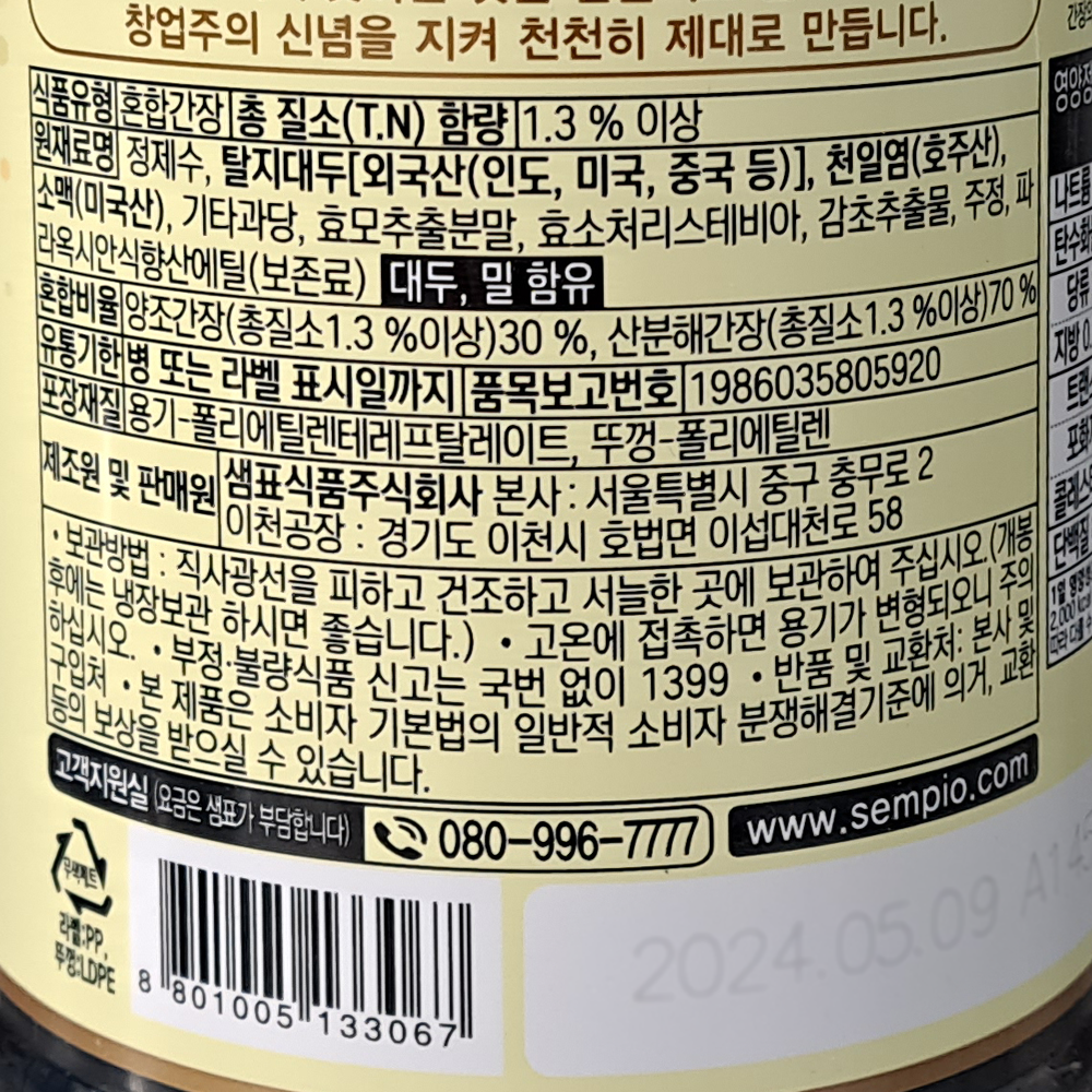 | 제품명 | 진간장 금F3 1.7L(음식점용)/샘표식품 |