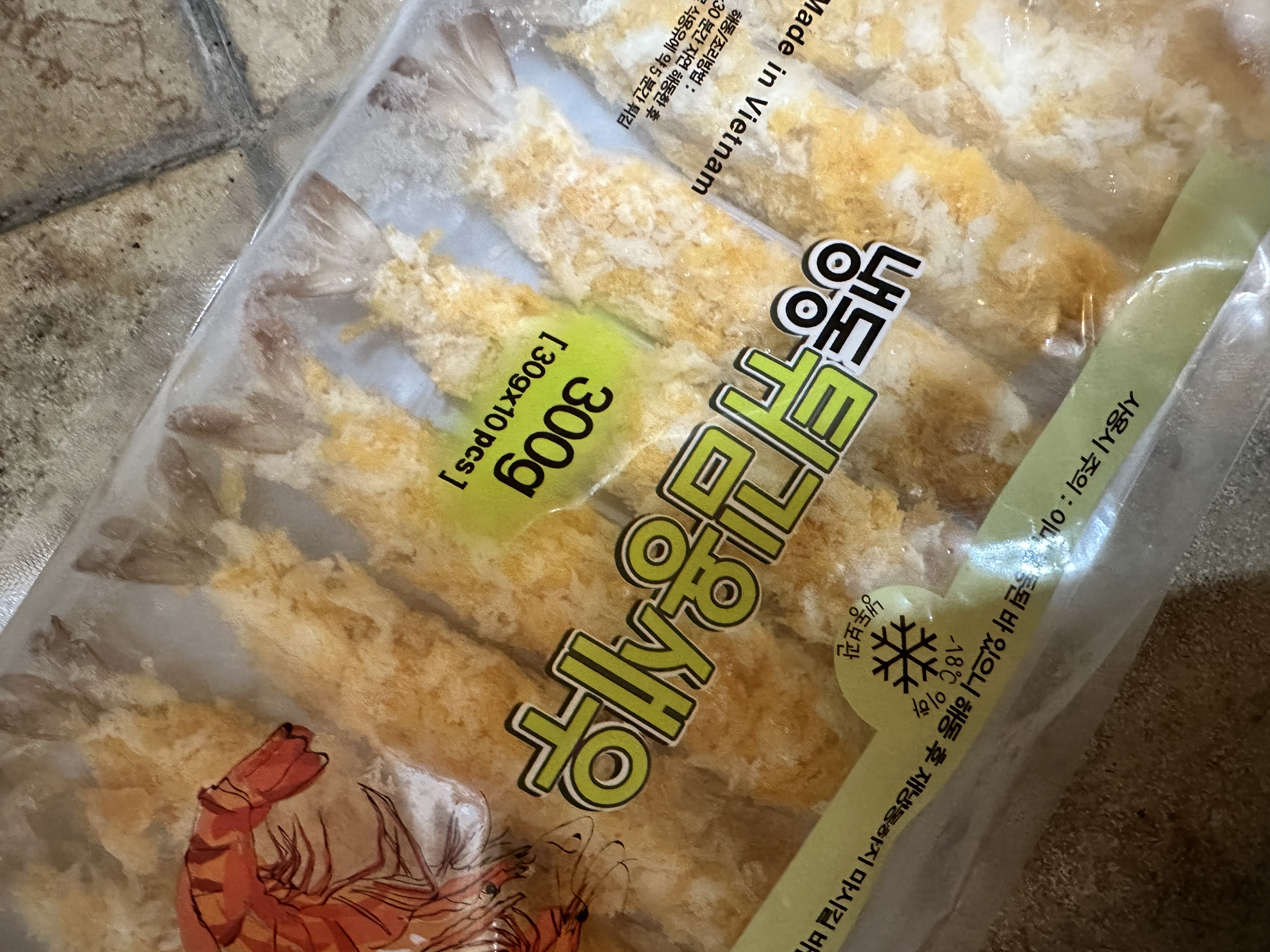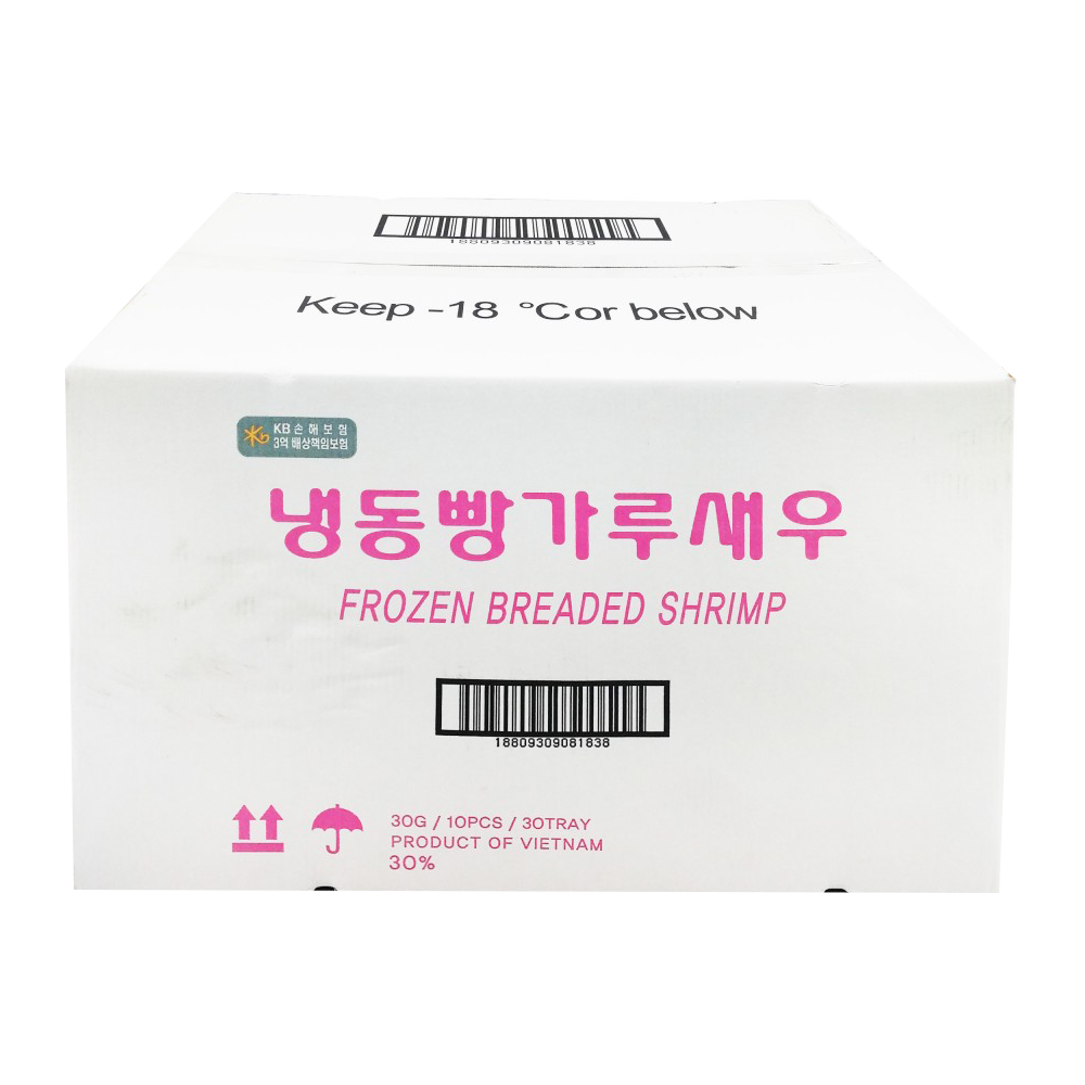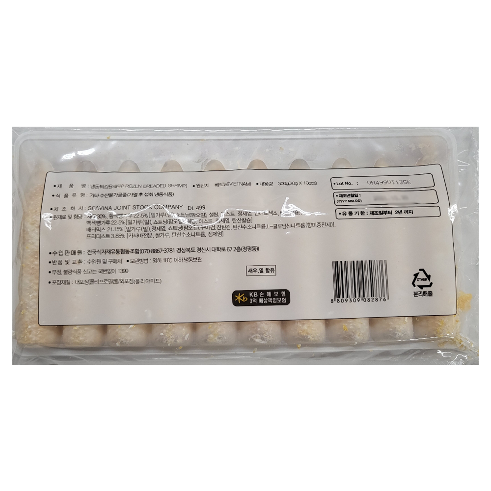 | 원재료명 및 함량(농수산물의 원산지 표시에 관한 법률에 따른 원산지 표시 포함) | 새우30%, 백색빵가루20.125%, 오렌지색빵가루20.125%, 배터믹스9.1%, 프리더스트3.15%, 정제수17.5% |