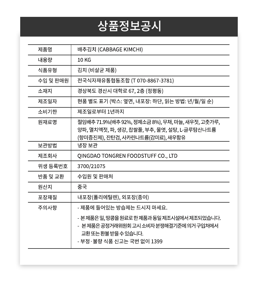 | 생산자 및 소재지(수입품의 경우 생산자, 수입자 및 제조국) | 원산지 : 중국산 수입원 : 전국식자재유통협동조합 제조사 : QINGDAO TONGREN FOODSTUFF CO.,LTD |