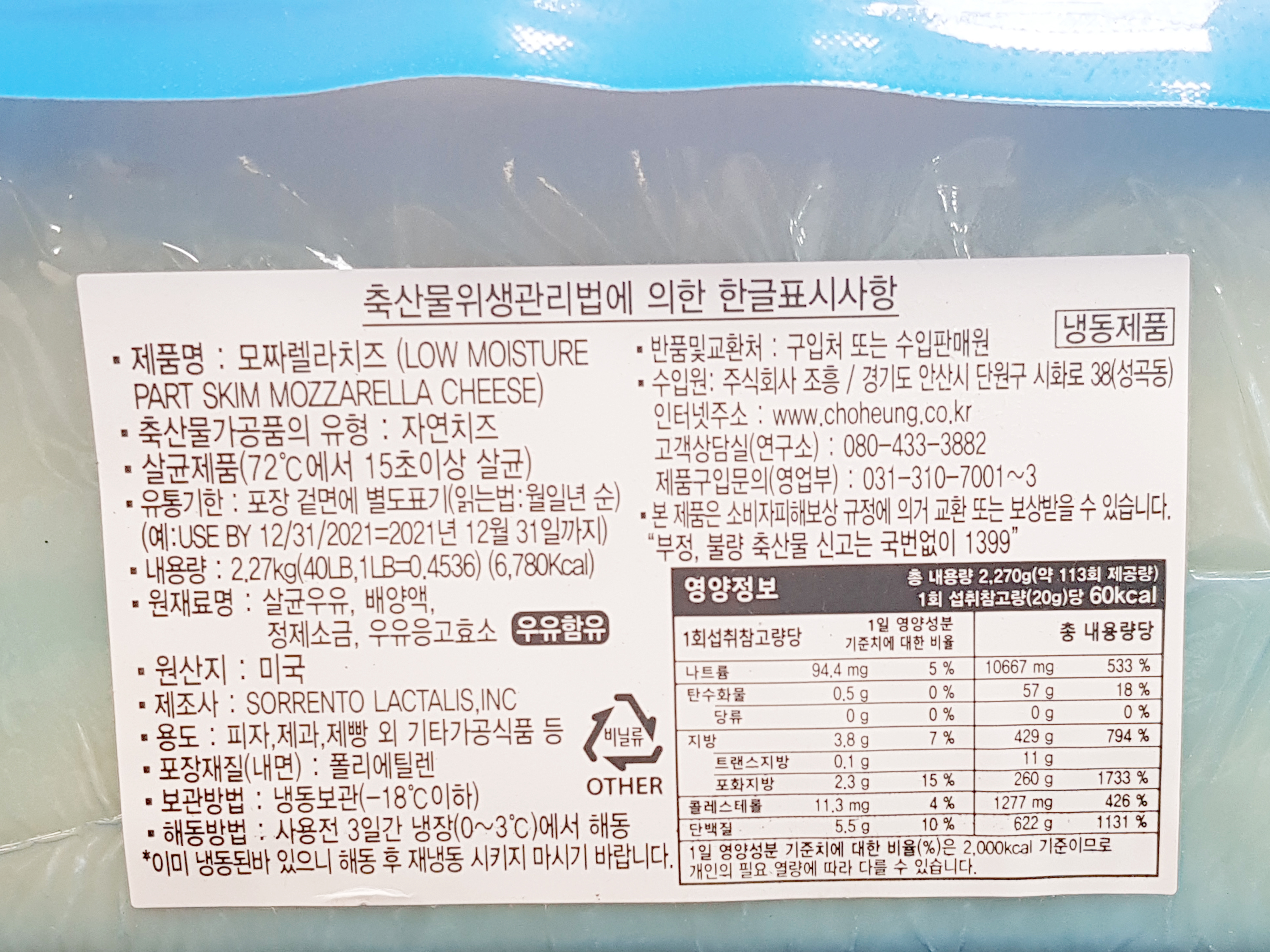| 생산자 및 소재지(수입품의 경우 생산자, 수입자 및 제조국) | 수입원 : (주)조흥 제조사 : SORRENTO LACTALIS, INC |