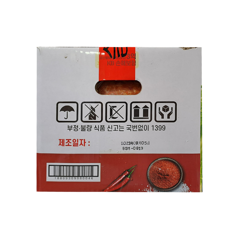 | 원재료명 및 함량(농수산물의 원산지 표시에 관한 법률에 따른 원산지 표시 포함) | 절임배추71.9%(배추92%,정제소금8%),무채5%,마늘4%,새우젓4%(새우75%,소금25%)고추가루3.5%,양파2.5%,멸치액젓2.5%(멸치75%,정제소금25%)파1.5%,생강1.5%,찹쌀풀1.5%,부추1%,물엿0.5%,설탕0.38%,L-글루타민산나트륨0.1%(향미증진제),잔탄검0.1%,사카린나트륨0.02%(감미료) |