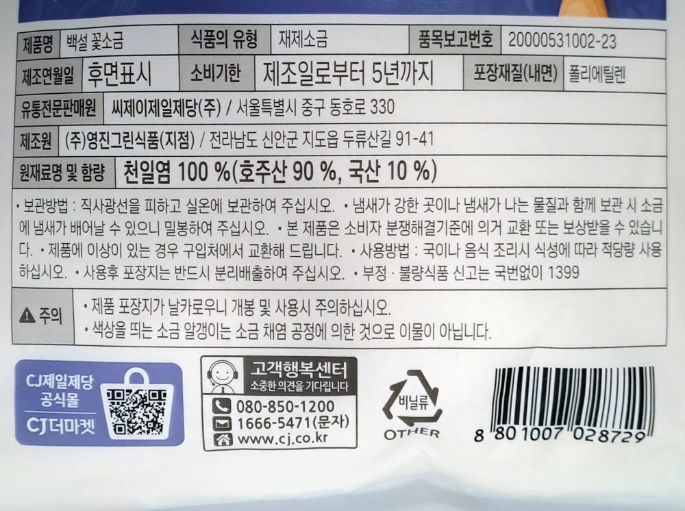 | 제품명 | 백설 꽃소금 1kg/CJ |