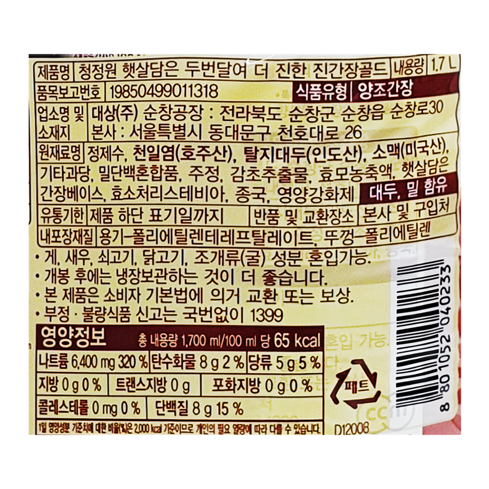 | 원재료명 및 함량(농수산물의 원산지 표시에 관한 법률에 따른 원산지 표시 포함) | 정제수,천일염,탈지대두,소맥,기타과당,밀단백혼합품,주정,감초추출물,효모농축액,햇살담은 간장베이스,효소처리스테비아,종국,영양강화제 |