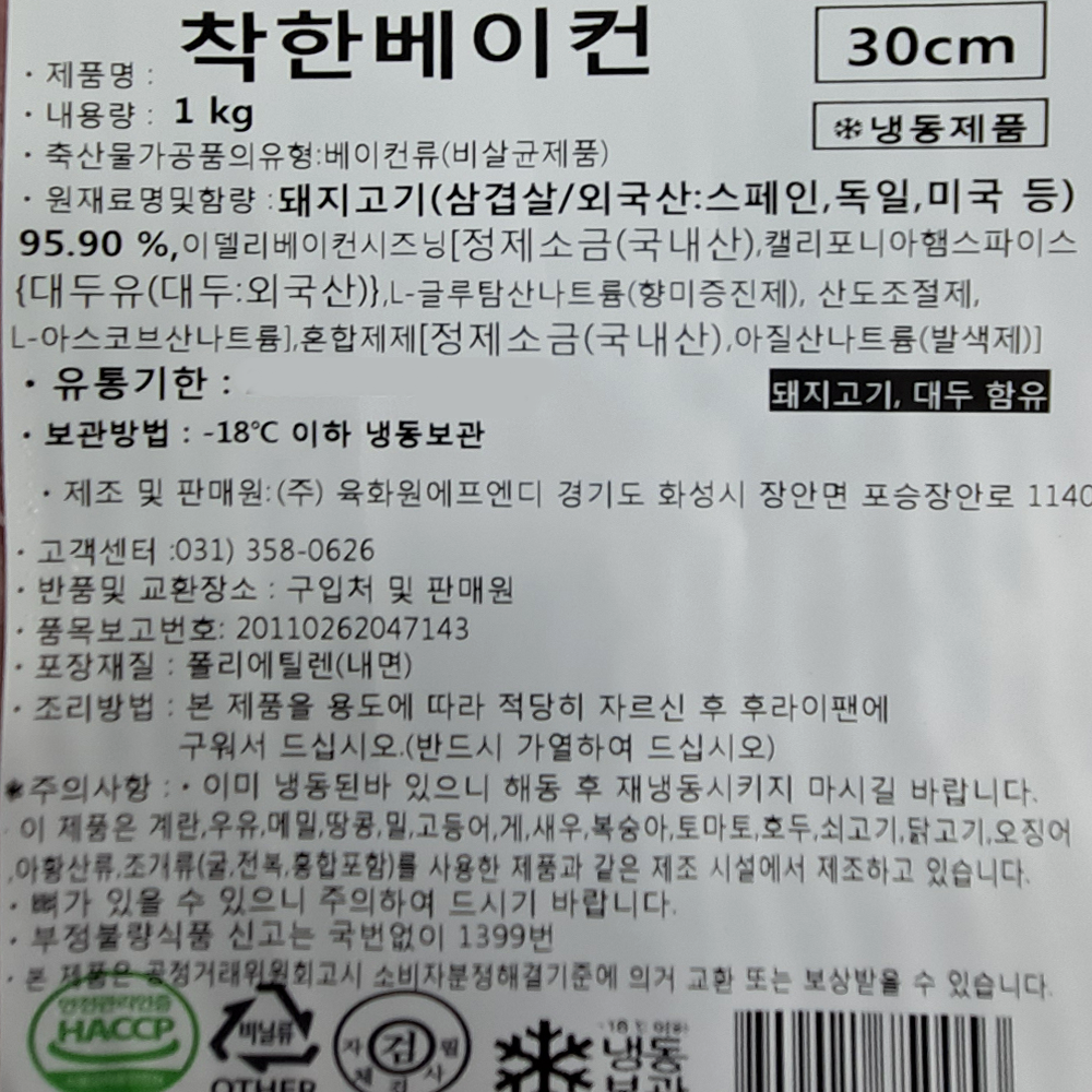 | 제품명 | 착한베이컨 1kg (30cm)/육화원 |
