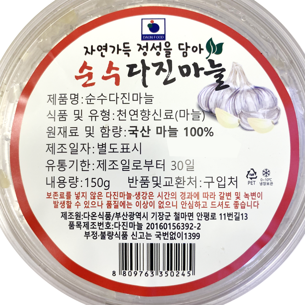 | 품목 또는 명칭 | 순수다진마늘·150g (국내산)/다온식품 |